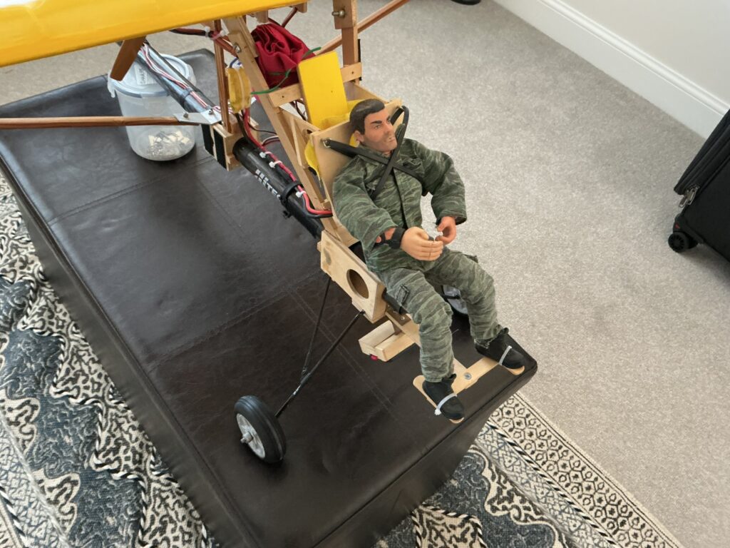This is a 50 inch wingspan pusher propelled model of the famous microlite towing lightweight aircraft. It has a carbon boom fuselage with balsa / ply flying surfaces strong undercarriage and powerful Graupner electric motor and airflow wooden propeller. Metal geared servos and runs on a 2200 mha LIPO battery. Some different over the field to fly. Will just need receiver and battery. The action man pilot is also included !