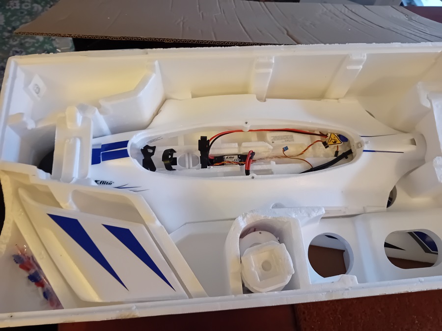 Some nose weight removed to allow a larger 3000 x 3s lipo to be used for much longer flights.