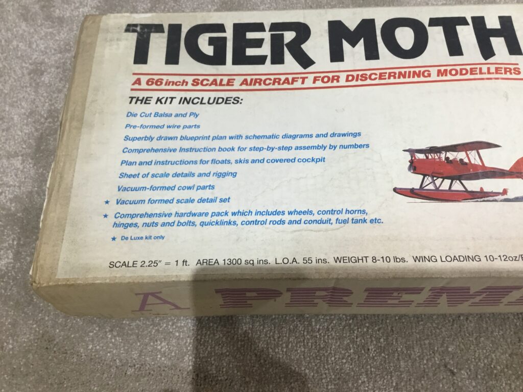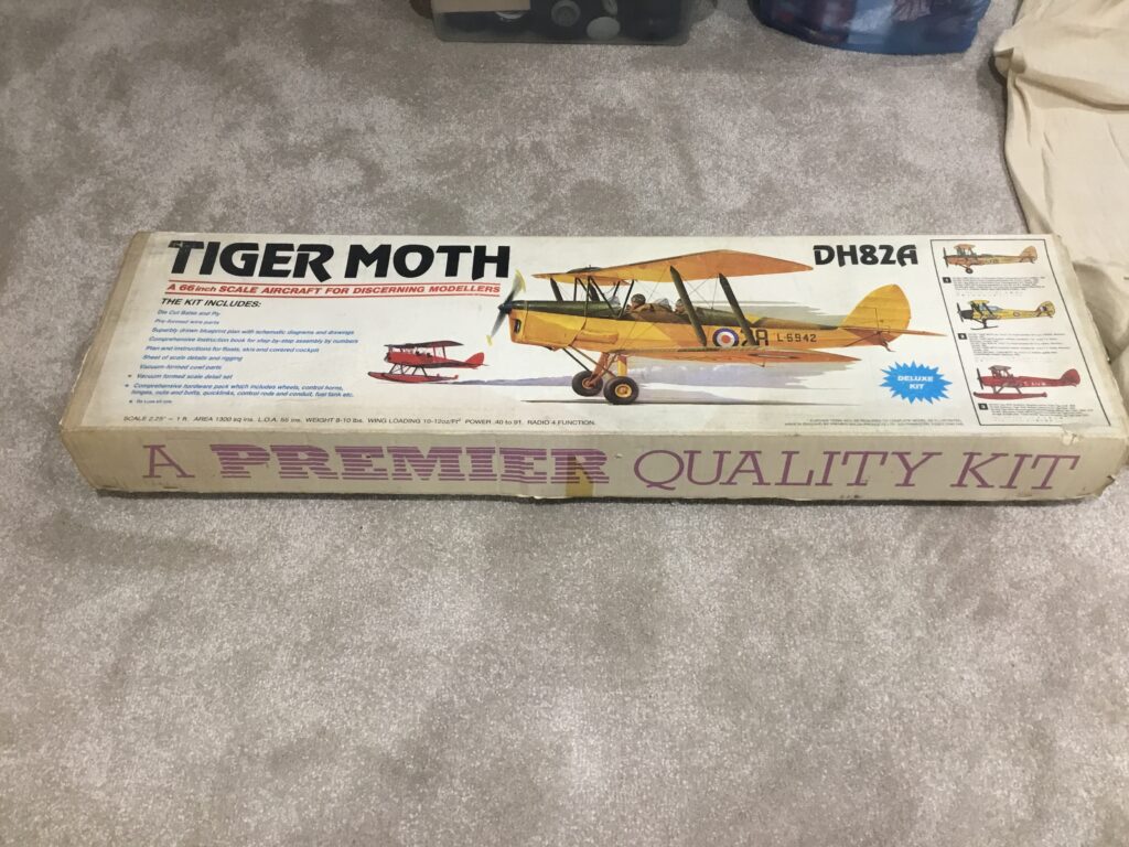 Premier Kits Tiger Moth Kit un started in as new condition plan has some yellowing 55 inch wing span for 60 to 90 ic motors