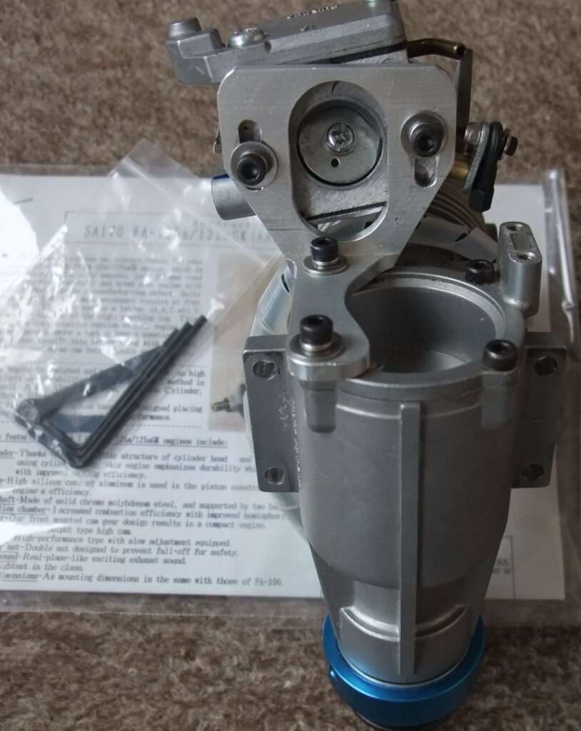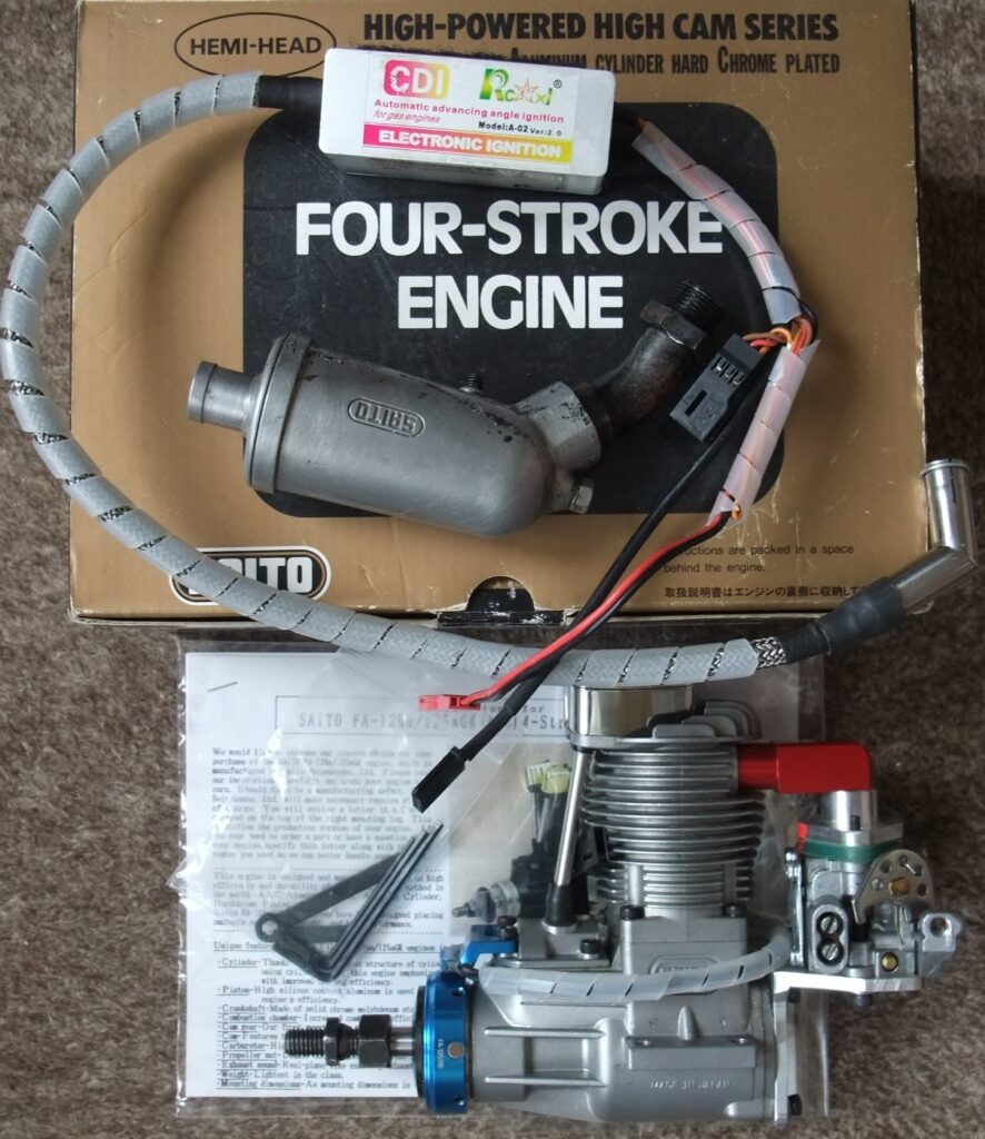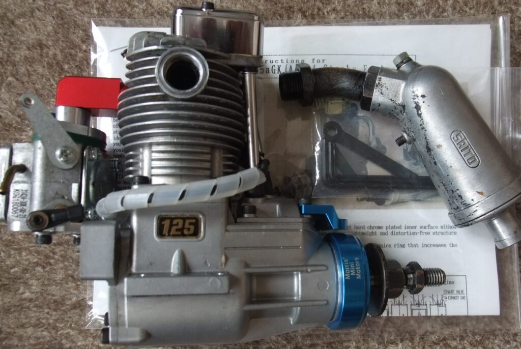 For sale Saito FA 125a four stroke engine with morris mini motors conversion to petrol run on 20 to 1 mix timing set at 30 degrees before T.D.C. comes with Rcexl electronic ignition, welbro carb, box and tools + instructions,