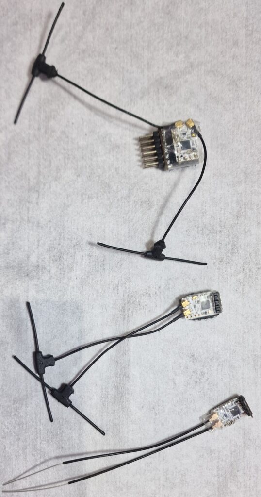 3 x TBS Tracer nano rx’s. 2 are wired for use with an FC, and the third has extra outputs for using directly with servos.