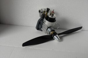 Brand new Cox 049 R/C, never been run, has a muffler and normal glow plug conversion and a radio controlled throttle and easy spring starter. This is a lovely engine and never seen fuel.