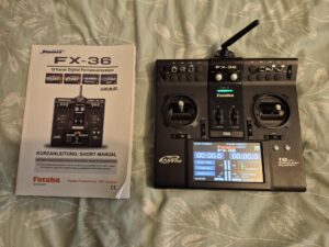 Futaba FX36 transmitter 18 Channel programable. Includes Instructions, original case, Futaba Lithium-Ion battery and charger. Also included is european style tray and weather shield (never used). Transmitter sit in this tray with original back (supplied). Also comes with Two point...